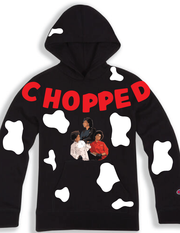 Stay Chopped with your exclusive gear! Chef Jacksons 90’s baby blood combined with her love for cows and passion for comfort cooking n clothing called for a sweatshirt thats one of a kind.
